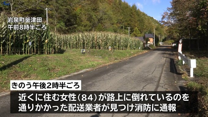 警察によりますと26日午後2時半ごろ、岩泉町釡津田の町道で近くに住む84歳の女性が路上に倒れているのを、通りかかった配送業者が見つけて消防に通報しました。