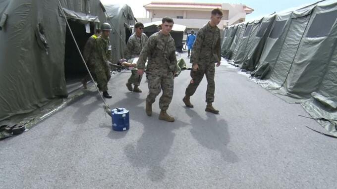 石垣駐屯地の広場には医療用のテントが設置され、けが人役の隊員らが運び込まれると、けがの程度によって優先順位をつけるトリアージを行ったあと、日本側と米軍側、共に協力しながら手当や治療を行っていました。