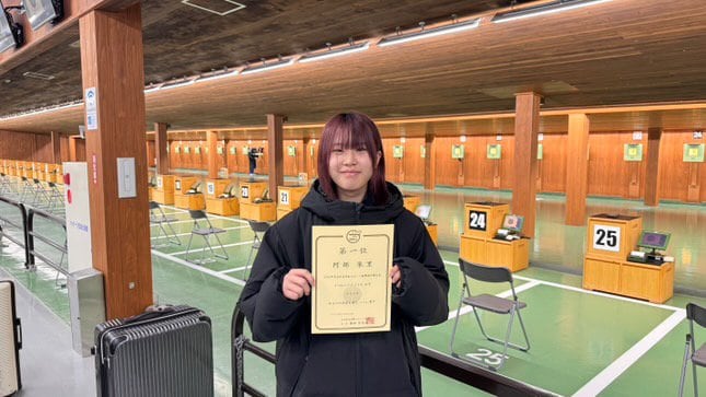 また、同じ日に行われた女子・10mエアピストルで岡山商科大1年阿部朱里選手が553点で優勝しています。