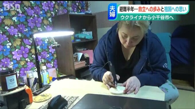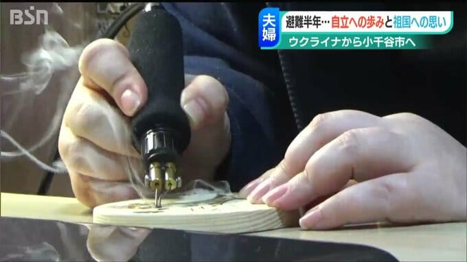 イリナさんは自宅でこのごろ、焼きゴテを手に机に向き合う時間が増えました。