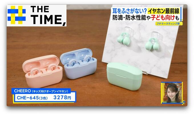 キッズ向けのオープンイヤーワイヤレスイヤホン「CHE-645」(CHEERO/3色・3278円)は、イヤーカフ型で耳への負担が少ない上に、耳の穴をふさがず清潔なため子どもにもピッタリです。