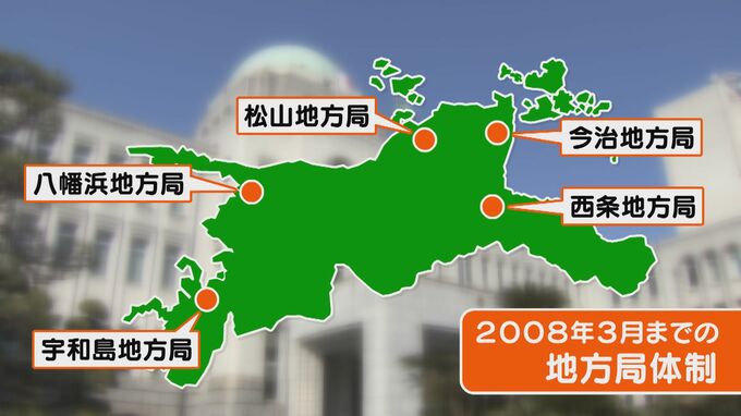 かつて、県の地方局は「西条・今治・松山・八幡浜・宇和島」の5か所が設けられていた。しかし、2008年に県の組織改編が行われた際、現在の「東・中・南予」の3か所に再編されたという。