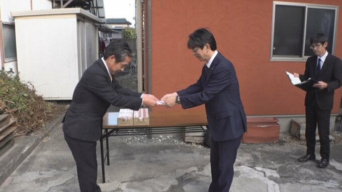 27日の式では果実連の代表者が、県の担当者に目録とみかんジュースを手渡しました。