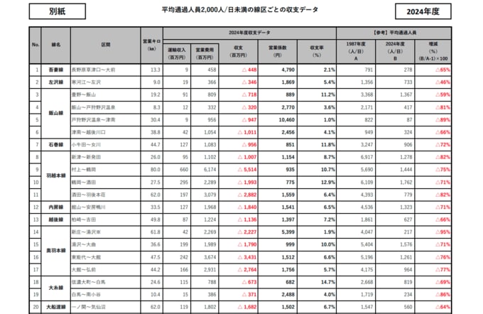 【2】平均通過人員2000人/日未満の線区ごとの収支データ【2024年度】 (東日本旅客鉄道株式会社の発表資料より)