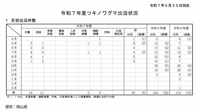 ところが...岡山県自然環境課によりますと、2025年度これまでに「ツキノワグマ」が岡山県内で確認された出没状況(目撃や痕跡)は、9月末現在で30件で、昨年同時期の75件と比べ、半分以下となっています【画像①】。