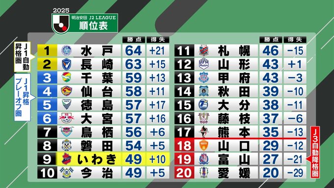 いわきはこの勝利で9位に浮上しました。J1昇格プレーオフ圏内6位との勝ち点差は8。昇格のためには残り4試合、1つも落とせません。