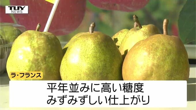 生産者からは今年のラ・フランスについて、猛暑や水不足の影響で小ぶりで生産量も2割ほど少なくなったものの糖度は平年並みに高く、みずみずしい出来となったことが伝えられました。