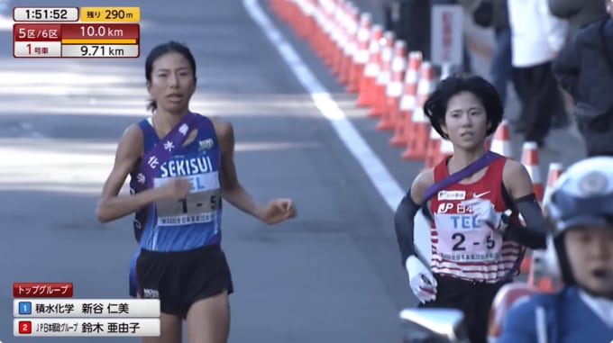 クイーンズ駅伝2024の5区での新谷(左)と鈴木(右)のデッドヒート