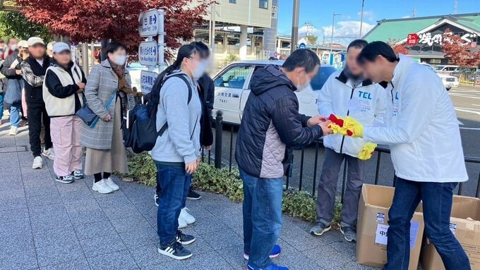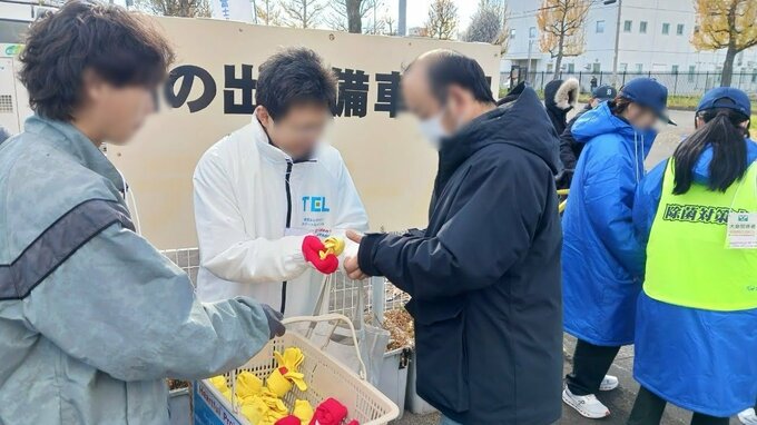 2024年の大会時の写真。東京エレクトロン宮城の従業員ボランティアが沿道で応援する人たちに手袋を配布する