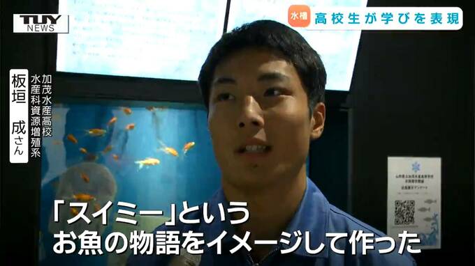 加茂水産高校 水産科資源増殖系 板垣成さん「スイミーというってお魚の物語をイメージして作った。自分たちで絵を描いたりして、物語に合ったイメージを出せるように作った」
