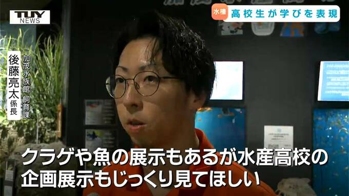 加茂水族館 飼育課 後藤亮太 係長「自然のままを切り取った展示をすることが多いが、それとはまた全然違った視点でレイアウトを考えてくれたりして逆にこっちが刺激を受けて参考になるような設置をしてくれた。クラゲや魚の展示もあるがぜひ水産高校の企画展示もじっくり見てほしい」