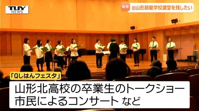 きのうは、実行委員会が講堂の歴史的価値や保存の必要性を広く知ってもらおうとイベントを開催。かつて講堂で授業を受けた山形北高校の卒業生などによるトークショーや、市民によるコンサートなどが行われました。