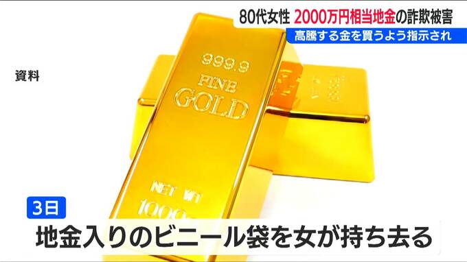 警察によりますと、9月25日に検事を名乗る男から女性の自宅に電話があり、男は「現金は犯罪収益金に換えられる恐れがあり金に換えた方がいい」と誘い、女性は地金930g(2000万円相当)を購入したということです。