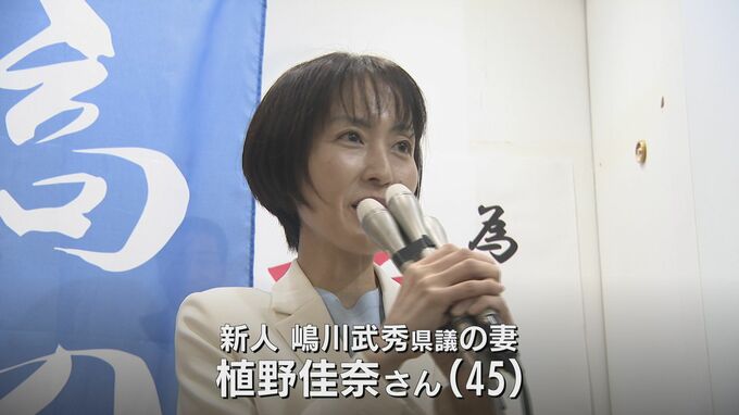 自民党・嶋川武秀県議の妻で芸能事務所社長の新人、植野佳奈さんが3867票を集め、トップで初当選を果たしました。