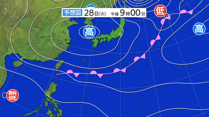 28日(火)の予想天気図に「台風のたまご=熱帯低気圧」の予想が出てきました。「熱帯低気圧」の動向も気がかりですが、日本付近はこの「熱帯低気圧」とは別の「発達する低気圧」によって、荒れ模様になるおそれがあります。