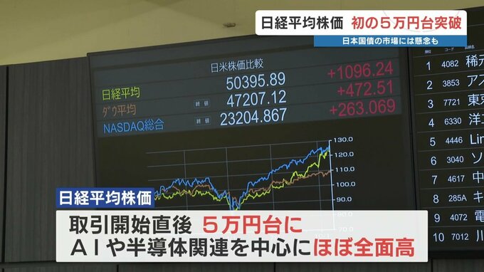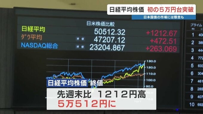 週明けの東京株式市場の日経平均株価は史上最高値となる5万円台に乗せて取引を終えました。