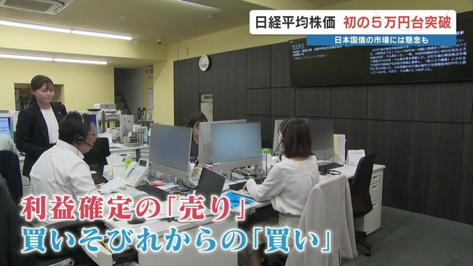 熊本県内の証券会社では、5万円台をつけると、利益確定の売りと買いそびれていた投資家が買いを入れる場面が交錯しました。