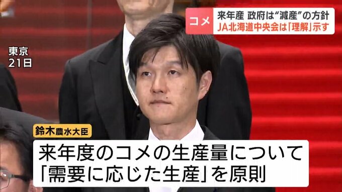 来年産の食用のコメの生産量について政府が増産方針から一転して今年より減産させると明らかにしたことを受け、JA北海道中央会は需要に合った作付けを行うと理解を示しました。