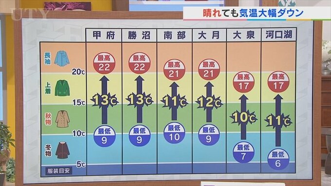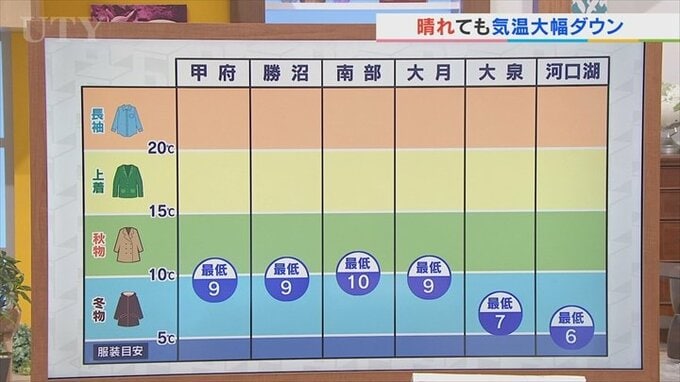 朝の最低気温がけさと比べて5℃前後低くなります。きょうの最低気温は各地10℃以上だったんですが、標高の高いこの河口湖ではあす6℃となります。さらに甲府も9℃ですから冬物コートが必要なくらいの体感となります。この気温で大体平年並みから11月上旬並みなんです。