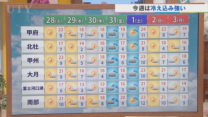 まず週間天気を見ていきますと、晴れれば地上から熱が逃げる放射冷却が効きやすくなりますので、特にあさって水曜日と木曜日は朝の冷え込みはぐっと強まります。