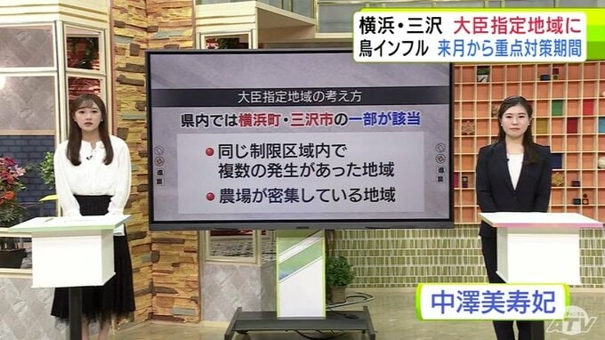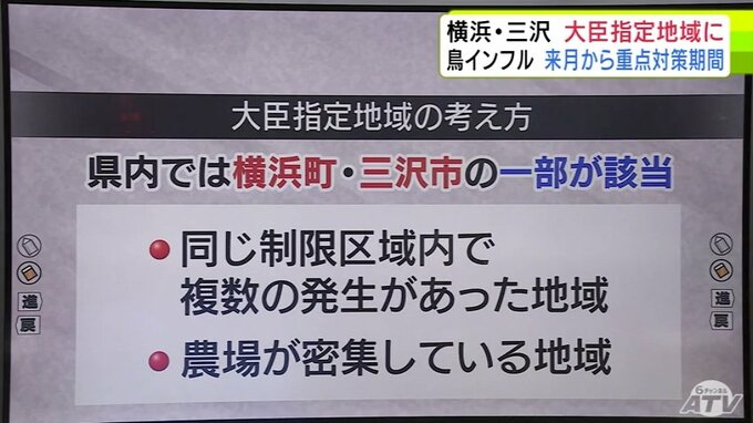 大臣指定地域は、同じ制限区域内で「鳥インフルエンザ」が複数発生した地域と農場が密集している地域が該当します。県内では横浜町と三沢市の一部がそれにあたります。