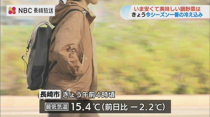 このうち長崎市ではきのうより2.2度低い15.4度を観測。