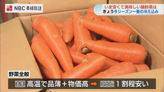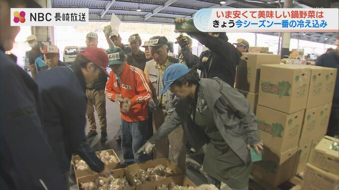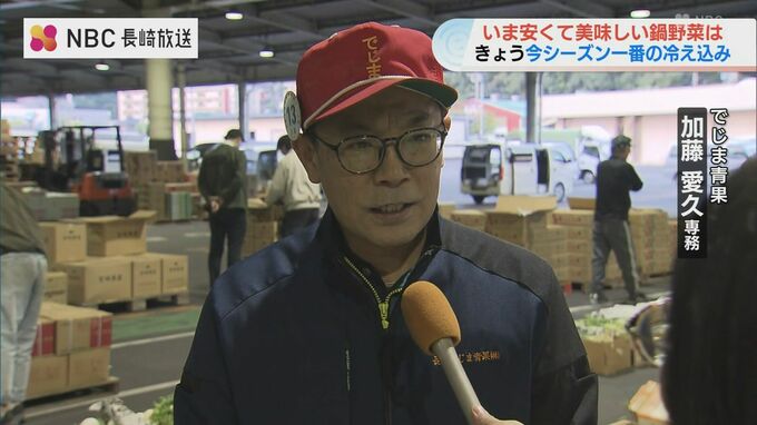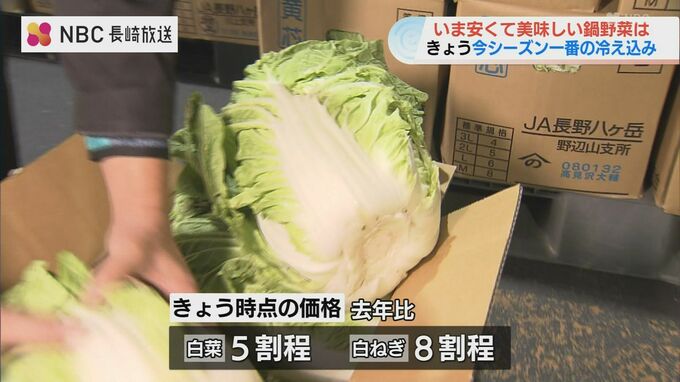 でじま青果によると、高温による品薄と物価高の影響が大きかった去年と比べ、ことしは野菜全般の価格が1割ほど安くなっていて、中でも、白菜と白ねぎは27日時点で去年の5割から8割ほどの価格でお買い得だということです。