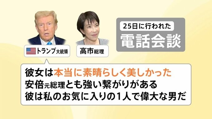 「彼女(高市総理)は本当に素晴らしく美しかった。安倍元総理とも強い繋がりがある。彼(安倍元総理)は私のお気に入りの1人で、偉大な男」