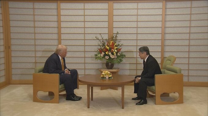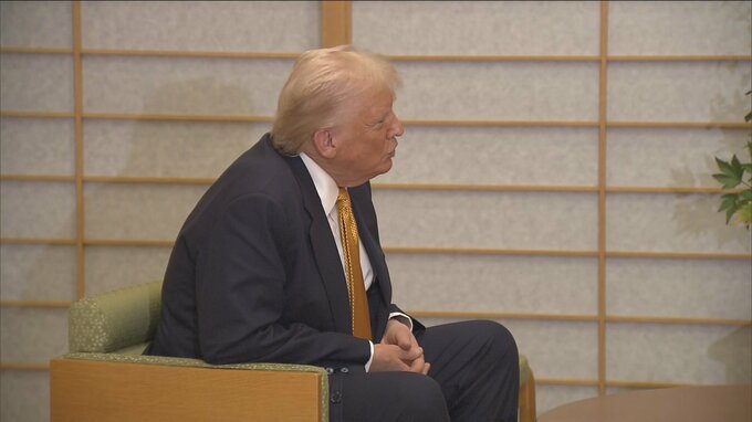 【写真で見るトランプ大統領来日】天皇陛下との写真撮影 大統領専用車「ビースト」の中で手を挙げ皇居を去るトランプ大統領 都内の大規模警備も TBSテレビ 2025年10月27日(月) 22:33 国内 なごやかな雰囲気で、約30分間行われた懇談では大谷選手の話題も