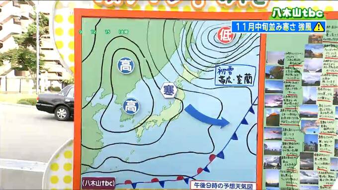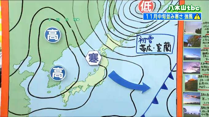 この寒気の影響は広範囲に及び、北海道の帯広と室蘭では初雪が観測されるなど、本格的な冬の到来を感じさせる状況となっています。福島の吾妻山でも初冠雪が観測されました。