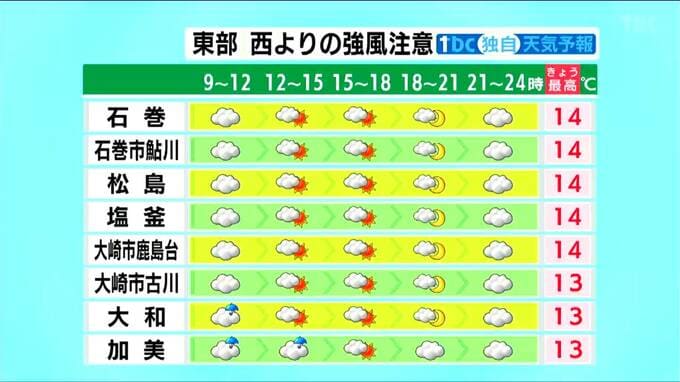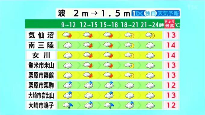 この日の予想最高気温は、県内で最も高いところでも15℃前後にとどまります。県北部では15℃に届かない地点も多く、鳴子や栗駒では12℃、築館や気仙沼で13℃、古川や米山で13℃の予想です。