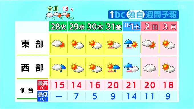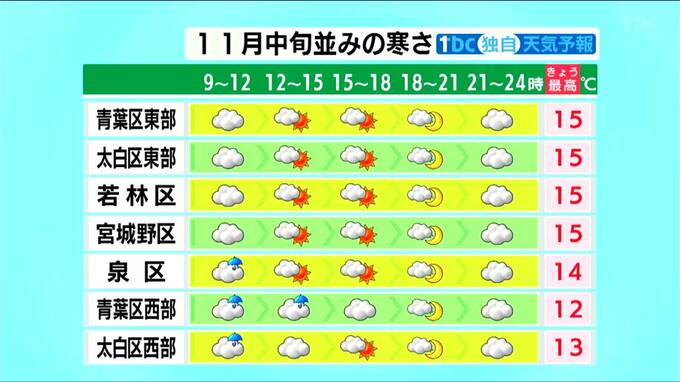 仙台市内では、午前9時頃から一旦雲が広がりやすくなり、西部を中心に雨が降りやすくなりますが、午後には次第に晴れ間が広がってくる見込みです。最高気温は14℃前後と11月中旬並みとなるため、暖かい服装の外出してください。