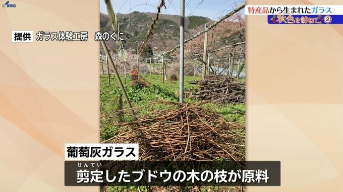 このガラスは、本来は廃棄してしまう剪定したブドウの木の枝を町内のブドウ畑から譲り受け、材料としています。