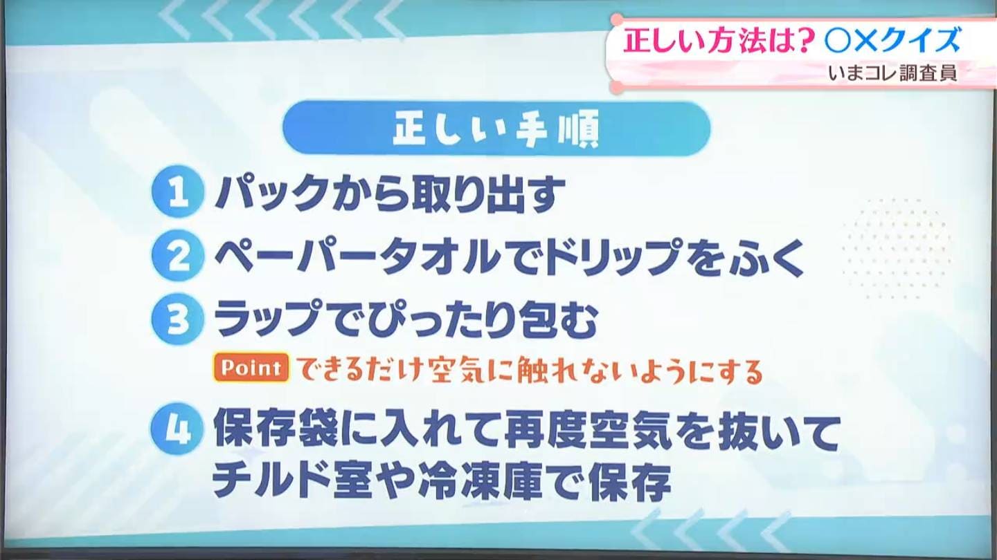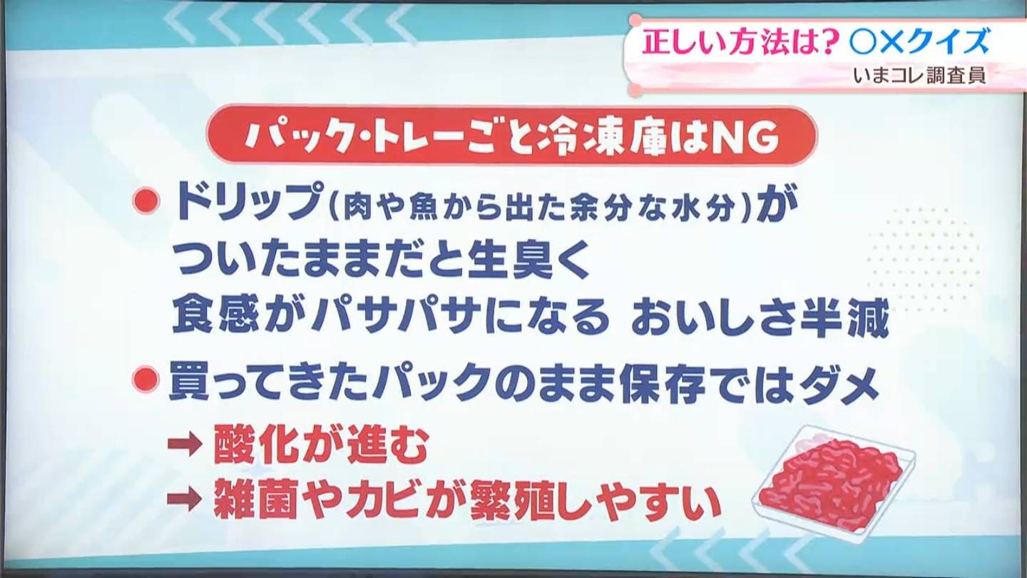 肉や魚から出た、余分な水分やドリップがついたままだと、生臭くなりますので、買ってきたパックのまま保存では駄目ということです。また、雑菌やカビも繁殖しやすくなります(【画像⑨】に不正解の理由)。