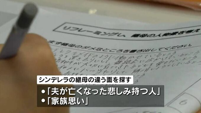 このあと、童話「シンデレラ」を題材に、いじわるな継母の良い面を探すワークショップが行われ、「夫が亡くなった悲しみを抱える人」や「家族思い」などの意見が出されました。