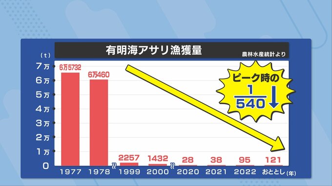 これは有明海におけるアサリの漁獲量の推移です。今やその数は激減し、ピーク時から約45年経った2023年は、540分の1ほどにまで減少しました。