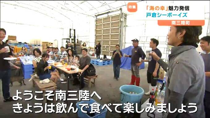 「ようこそ南三陸へ!今日は飲んで食べて楽しみましょう!乾杯!」
