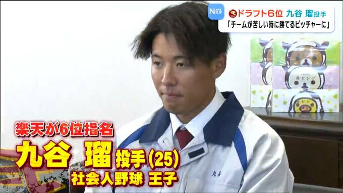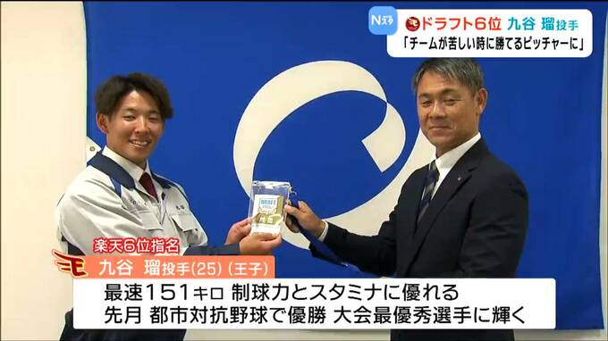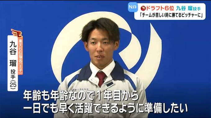 楽天イーグルスは、ドラフト6位で指名した社会人野球・王子の九谷瑠投手に指名あいさつを行いました。