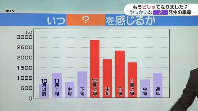 いつ静電気を感じるか という質問に対し、多いのが12月から1月にかけて。いまが一番多い時期です。
