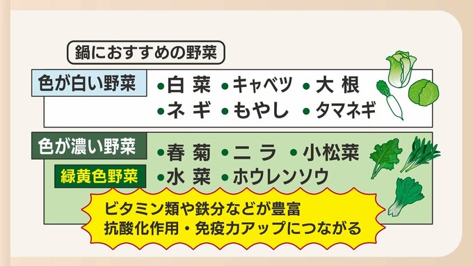 「やはり鍋というとイメージ的には白菜や大根など白い野菜を選びがちですが、例えば春菊や小松菜など色の濃い野菜を入れると抗酸化力が期待できたり、免疫力アップにつながったり期待できるのでおすすめです」