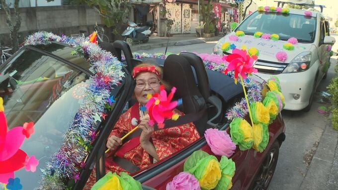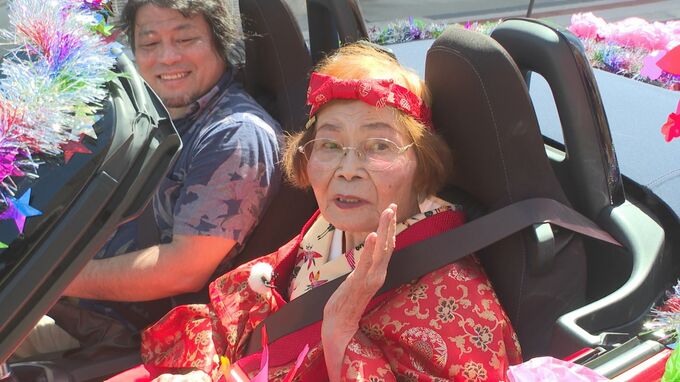 俊子さんを乗せた車は、約450mの道のりをゆっくりと進んでいく。沿道からは祝福の声と拍手が絶え間なく送られ、見守る人たちは興奮気味の笑顔を見せた。