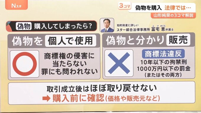 知的財産に詳しいスター綜合法律事務所・冨宅恵弁護士によると、偽物を個人で使用するのは、商標権の侵害に当たらず、罪にも問われないということです。