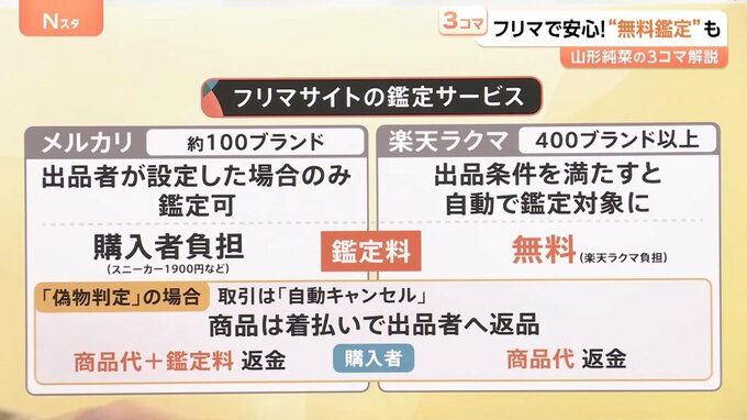 「メルカリ」(約100ブランド)では、出品者が設定した場合のみ鑑定可能で、鑑定料は購入者の負担(スニーカー1900円など)です。