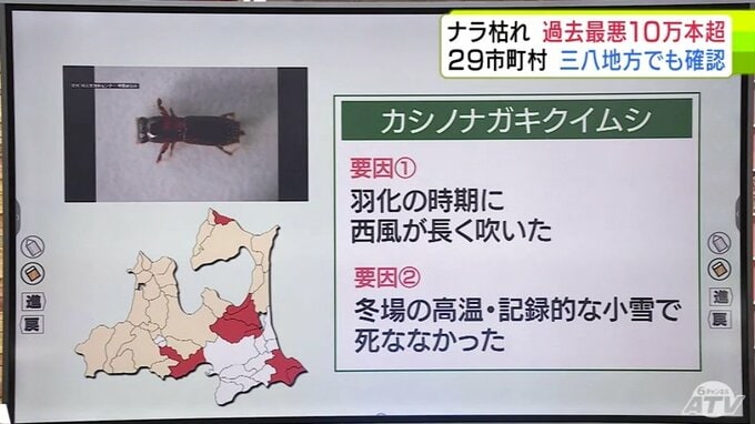 「ナラ枯れ」は、カシノナガキクイムシが運ぶ菌に感染して広がります。この虫が羽化する時に西風が長く吹いたことが大きなポイントになります。さらに、この虫が冬場の高温と記録的な小雪で樹の中で死んでいなかったことが要因として挙げられています。