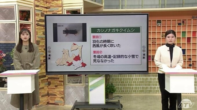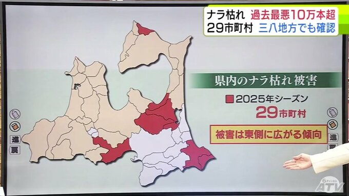 県内で被害を受けた市町村は29市町村あり、このうち新たに被害が確認されたのは濃い赤で示した7市町村です。このうち八戸市・階上町の三八地方では初めて被害が確認されました。ここから分かることは、被害は東側に広がっている傾向があることです。