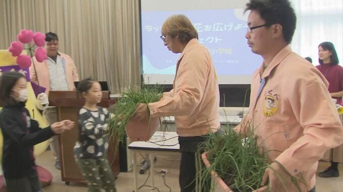 28日は中ノ郷小学校を訪れ、ラッキョウが持ち込まれた歴史や栽培方法、おいしい食べ方などについて説明したあと、夏に植えたラッキョウをプランターの形でプレゼントしました。