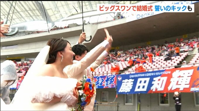 新潟市中央区の運動施設デンカビッグスワンスタジアムで26日、男子プロサッカーJ1リーグ・アルビレックス新潟対ヴィッセル神戸戦の応援に集まったサポーターたちが証人となる『人前結婚式』が行われました。試合…