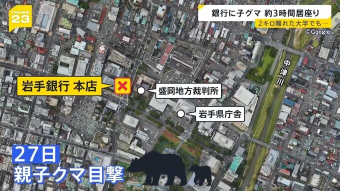 走って建物に入っていくクマ。すぐ近くには自転車に乗った人もいます。警察などによると、28日午前7時ごろ、岩手県盛岡市の「岩手銀行本店」の駐車場に子グマ1頭が侵入。現場は県庁や裁判所などが立ち並ぶ市の中心街で、周辺では27日、親子のクマの目撃情報が確認されていたといいます。