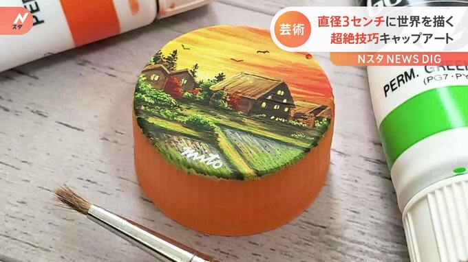 製作時間は約4時間!ペットボトルのキャップに描いた夕陽に染まる「白川郷」など小さなキャップに“壮大な世界”は必見です。暗闇の中、キラキラと輝く幻想的なメリーゴーランドや…ペロッと舌を出した姿がとって…