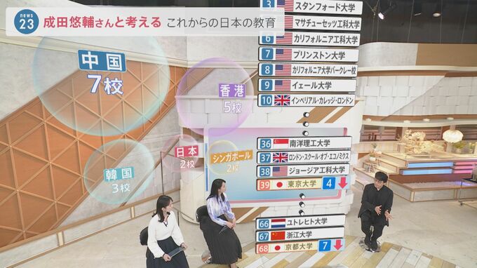 さらに、100位以内に入っている大学のうち、アジアで見てみると中国が7校、香港が5校となっていて日本は2校というデータもあります。